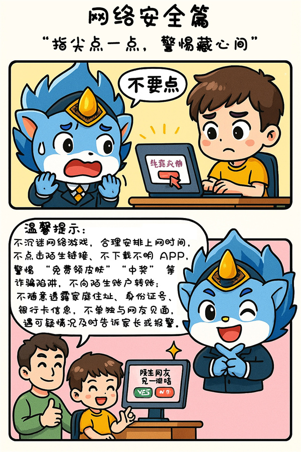同学们,暑假已经悄悄溜走一大半啦!是不是已经解锁了不少快乐玩法?但桦小法要悄悄提醒大家:欢乐再多,安全这根“弦” 可不能松哦~ 不管是出门耍、宅家玩,还是上网冲浪,藏在身边的小风险可得提前防备。下面这些漫画里的场景,说不定你也曾遇到过,跟着桦小法一起看看,怎样才能让剩下的假期既开心又安心吧!