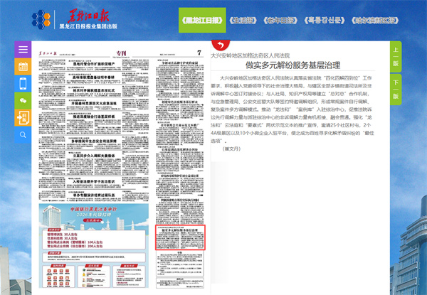 大兴安岭地区加格达奇区人民法院认真落实省法院“四化四解四到位”工作要求,积极融入党委领导下的社会治理大格局,与辖区全部乡镇街道司法所及非诉调解中心签订对接协议;与人社局、知识产权局等建立“总对总”合作机制,与应急管理局、公安交巡警大队等签约特邀调解组织,形成常规案件自行调解、复杂案件多方调解模式。推动“龙法和”“案例库”入驻综治中心,促推法院诉讼先行调解力量与派驻综治中心的非诉调解力量有机衔接、融会贯通。强化“龙法和”云法庭和“要素式”两状示范文本的推广宣传,邀请25个社区村屯,2个4A级景区以及10个小微企业入驻平台,使之成为百姓寻求化解矛盾纠纷的“最佳选项”。