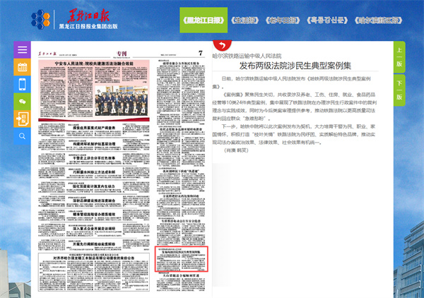 《黑龙江日报》:哈尔滨铁路运输中级人民法院 发布两级法院涉民生典型案例集