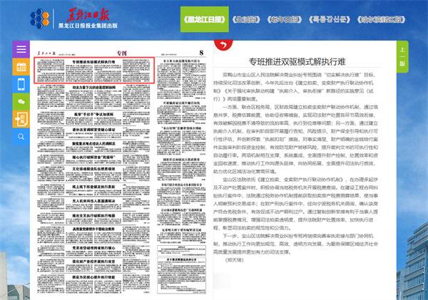 双鸭山市宝山区人民法院解决商业纠纷专班围绕“切实解决执行难”目标,持续深化司法改革创新,今年先后出台《建立拍卖、变卖财产执行联动协作机制》《关于强化审执联动构建“执前介入、审执衔接”新路径的实施意见(试行)》两项重要制度。