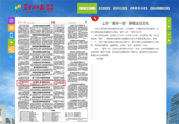 为深入贯彻落实省法院新时代龙法“文化铸品”十项建设任务目标要求,牡丹江铁路运输法院融媒中心推出“晨学一刻”广播学习栏目。