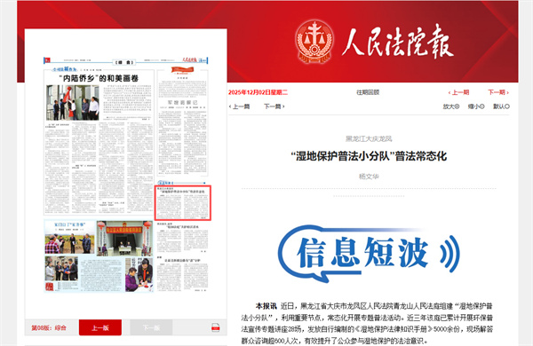 近日,黑龙江省大庆市龙凤区人民法院青龙山人民法庭组建“湿地保护普法小分队”,利用重要节点,常态化开展专题普法活动。近三年该庭已累计开展环保普法宣传专题讲座28场,发放自行编制的《湿地保护法律知识手册》5000余份,现场解答群众咨询超600人次,有效提升了公众参与湿地保护的法治意识。