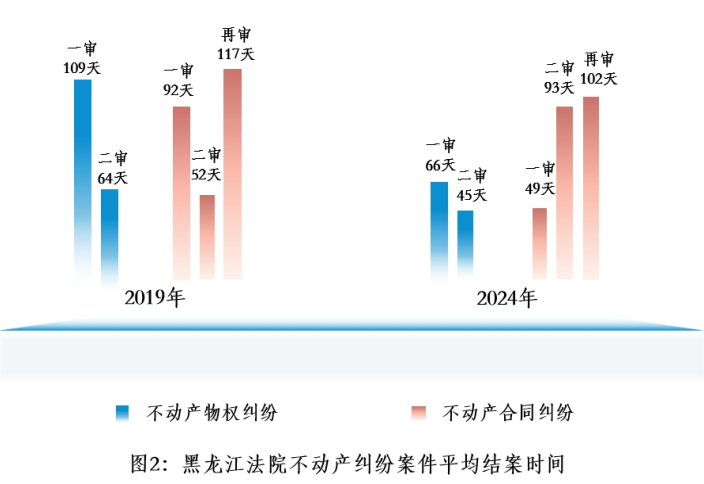 数据显示:五年来,全省法院不动产纠纷案件总量稳步下降,一审结案数量由2019年的15334件下降至2024年的9402件,降幅为38.69%;不动产纠纷案件审理周期持续压缩,当事人的诉讼时间成本不断降低,其中不动产物权纠纷一审案件平均结案时间由2019年的109天下降至2024年的66天,不动产合同纠纷一审案件平均结案时间由2019年的92天下降至2024年的49天。