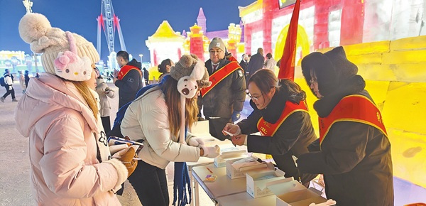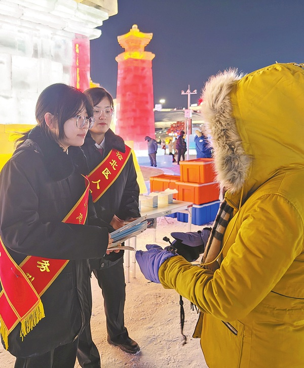 12月17日,第二十七届哈尔滨冰雪大世界正式开园,黑龙江省哈尔滨市松北区人民法院旅游巡回法庭党员志愿服务队来到景区,开展党建和旅游司法服务活动。从法律咨询到纠纷预警,从温馨提示到案例讲解,干警们在严寒中默默坚守,让法治伴随每位游客的冰雪旅程。