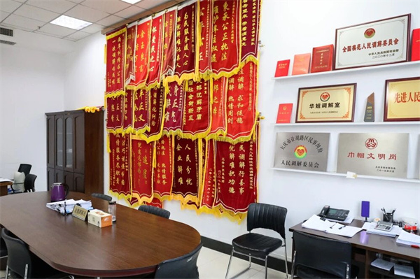 在这个门边的墙壁上看到一面红色的牌子,写着“华姐调解室”,还有一句特别暖心的话——“怀着希望来,带着满意走”。