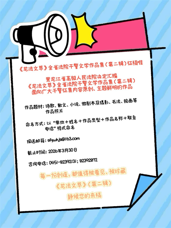 投稿方式:请将作品以“单位 + 姓名 + 作品类型 + 作品名称 + 联系电话”格式命名,以各中级人民法院为单位,对辖区内作品统一收集、审核并报送至邮箱:sfywhjs@163.com