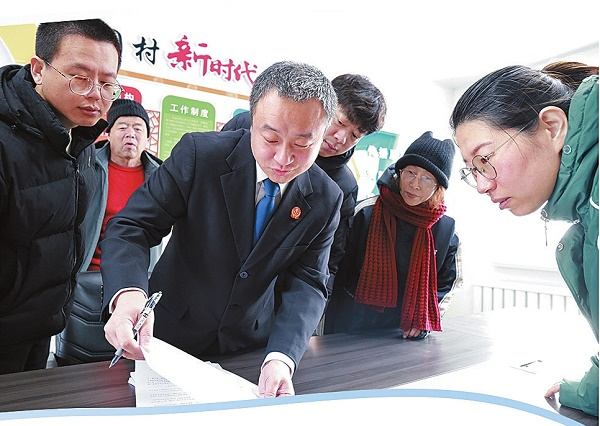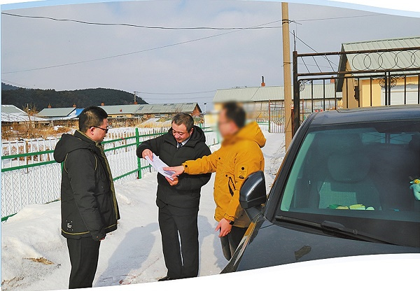 图①:执行干警来到爱国村找到被执行人孟某并出具执行通知书。