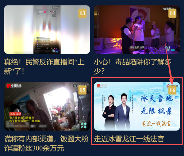 2.下滑页面到16号作品《走近冰雪龙江一线法官》,点击进行播放,即可助力!