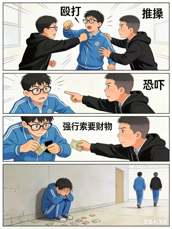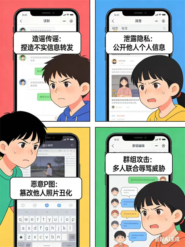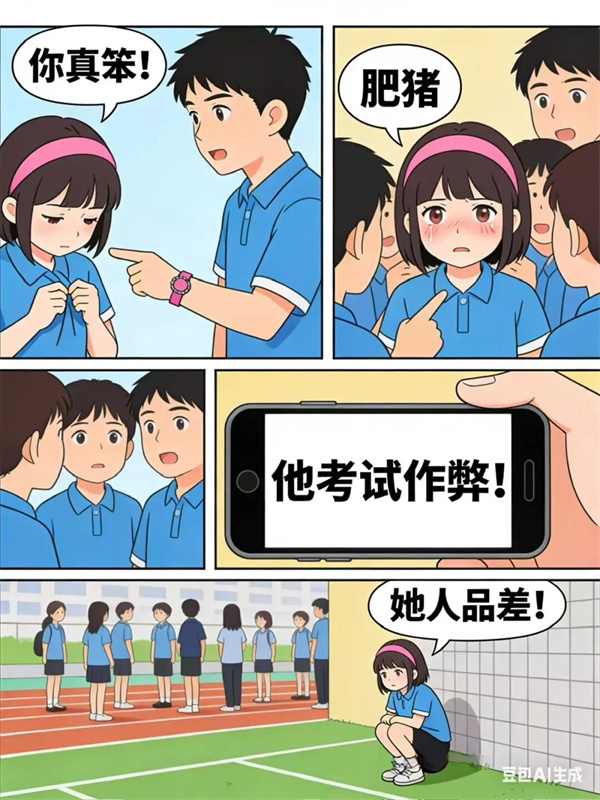 校园欺凌不是“小打小闹”,也不是“同学间的玩笑”,除了殴打、恐吓、强行索要财物等暴力行为,辱骂、起侮辱性绰号、恶意诋毁、散布谣言、恶意孤立、造谣传谣、曝光隐私、恶意P图、群聊攻击等“软暴力”同样是校园欺凌……