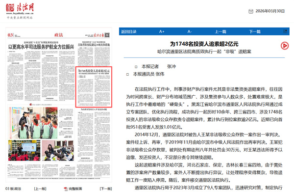 《法治日报》:为1748名投资人追索超2亿元 哈尔滨道里区法院高质效执行一起“非吸”退赔案