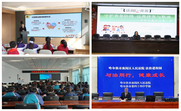 有效防范校园欺凌,既是对学生合法权益的守护,也是维护校园安宁与社会和谐的重要基石。为增强学生自我保护能力,双鸭山中院、哈尔滨市南岗区法院等走进中小学校,针对学生身心发展特点,以预防校园欺凌为主题,通过真实案例,警示学生不当“沉默者”,不做“小霸王”。大庆高新区法院联合团市委等多部门共同打造聚焦校园霸凌题材原创有声剧《我为你发声》,创新采取“沉浸式互动+探秘式体验”模式,让广大青少年直观感受霸凌的危害,筑起反校园霸凌法治防线。黑河市爱辉区法院走进特殊教育学校开展针对性法治教育,向家长发放《致家长的一封信》,为孩子织密“保护网”。