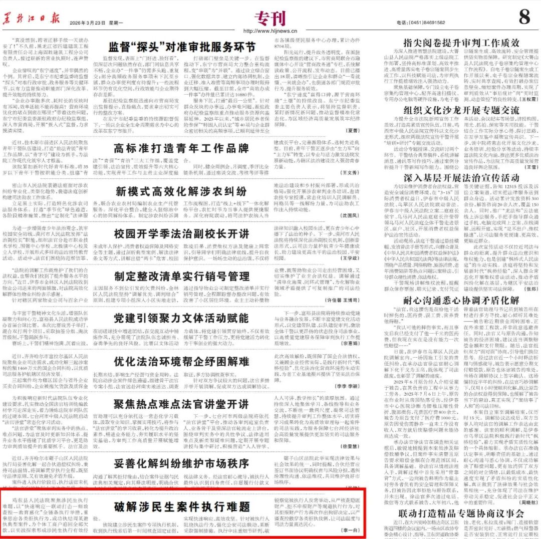 鸡东县人民法院聚焦涉民生执行难题,以“快速响应—联动打击—细致查控—教育感化”全链条执行举措,重拳惩治各类拒执行为,成功执结周某避执典型案件,为个体工商户追回全部欠款,以实战探索形成涉民生执行有效经验。