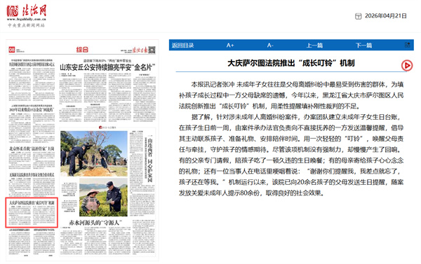 未成年子女往往是父母离婚纠纷中最易受到伤害的群体,为填补孩子成长过程中一方父母缺席的遗憾,今年以来,黑龙江省大庆市萨尔图区人民法院创新推出“成长叮铃”机制,用柔性提醒填补刚性裁判的不足。