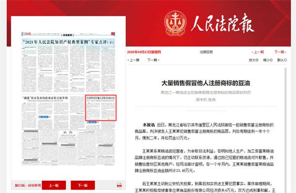 近日,哈尔滨市道里区法院审结一起销售假冒注册商标的商品案,判决被告人王某某犯销售假冒注册商标的商品罪,判处有期徒刑一年十个月,缓刑二年,并处罚金12万元。