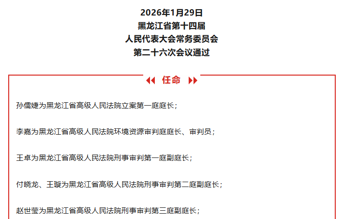 2026年1月29日黑龙江省第十四届人民代表大会常务委员会第二十六次会议通过 任命 孙儒婕为黑龙江省高级人民法院立案第一庭庭长; 李嘉为黑龙江省高级人民法院环境资源审判庭庭长、审判员; 王卓为黑龙江省高级人民法院刑事审判第一庭副庭长; 付晓龙、王璇为黑龙江省高级人民法院刑事审判第二庭副庭长; Q..