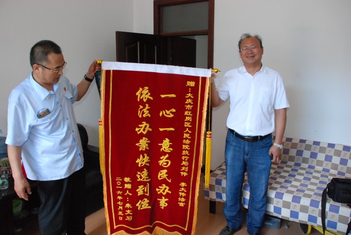 7月7日上午,申请执行人朱某的家人将一面绣有“一心一意为民办事,依法办案快速到位”的锦旗送到大庆市红岗区人民法院执行局梁洪庆局长手中,以表达他们对承办法官践行司法为民的敬意。原来,这是一起因被执行人下落不明而沉积十二年的积案,申请执行人朱某已经八十高龄。2006年6月27日,申请执行人给红岗法院执行..