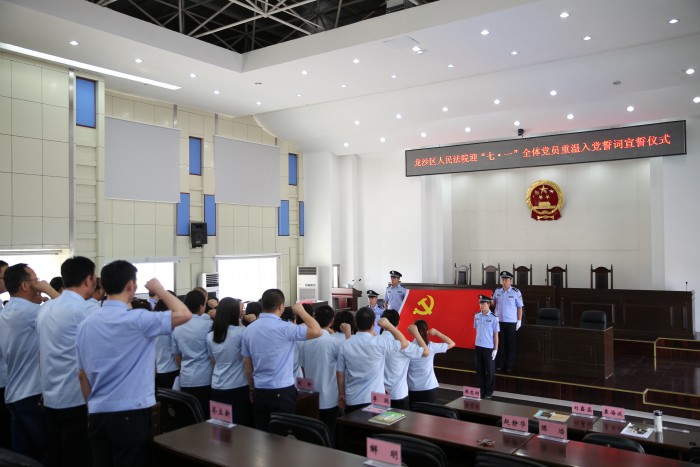 6月28日下午 ,齐齐哈尔市龙沙区人民法院举行迎“七.一”全体党员重温入党誓词宣誓仪式,向建党95周年献礼。“我志愿加入中国共产党,拥护党的纲领,遵守党的章程,履行党员义务……严守党的纪律……对党忠诚,积极工作……”。全体党员表情严肃,高举右拳,面向党旗,在领誓人的带领下郑重宣誓,表达了对党的无限..