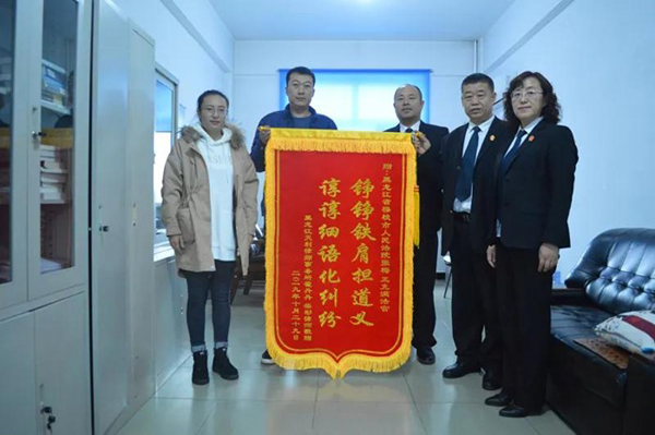 近日,绥北法院红色边疆人民法庭干警驱车60余公里,来到位于黑河市的当事人家中,办理一起法定继承纠纷案件。当事人赵某因遗产继承纠纷到法院提起诉讼。被告是一位87岁高龄的老人且行动困难,不便到法庭参加诉讼,生活在外地的子女又刚好回到黑河市还没离开,法庭负责人黄利国了解情况后,决定上门办理此案。通过耐..