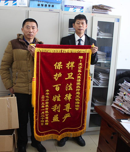春节将近,齐齐哈尔龙沙区法院 “保民生护民营”专项执行活动收效显著。近日,丰华电力安装有限公司代表专程来到龙沙区法院,将印有“捍卫法律尊严,保护百姓利益”的锦旗送到执行法官王晓海的手中,并连声感谢法官在其单位申请执行后,仅用不到40天的时间就执行回拖欠已久的十四万余元货款。龙沙区法院积极贯彻落..