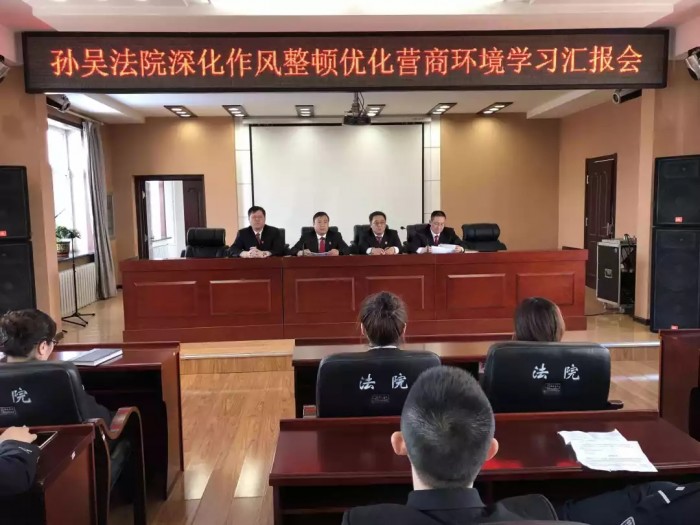 4月18日,孙吴法院集中开展优化营商环境再学习、再动员专题活动,对近期上级院和县委下发的文件逐条进行宣讲,要求全院上下要进一步树立热情、公正、高效、廉洁的服务理念,坚持公正司法、一心为民,全力优化窗口服务、重商护商的营商环境。会上,立案庭、执行局、书记官室代表本科室做表态发言,他们表示要规范个..