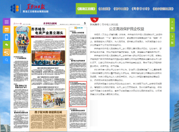 《黑龙江日报》报道齐齐哈尔中院:公正高效保护民企权益