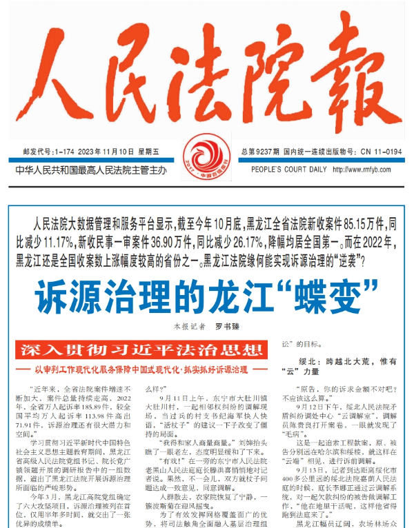 《人民法院报》头版头条报道:诉源治理的龙江“蝶变”