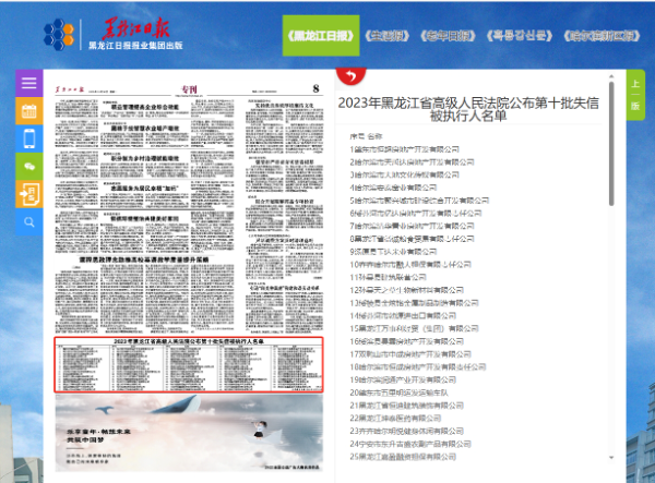 《黑龙江日报》:2023年黑龙江省高级人民法院公布第十批失信被执行人名单