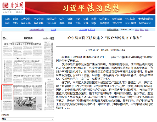 《法治日报》:哈尔滨南岗区法院建立“医疗纠纷法官工作室”