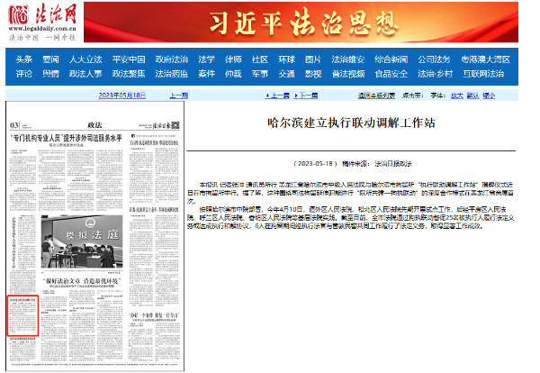《法治日报》报道:哈尔滨建立执行联动调解工作站