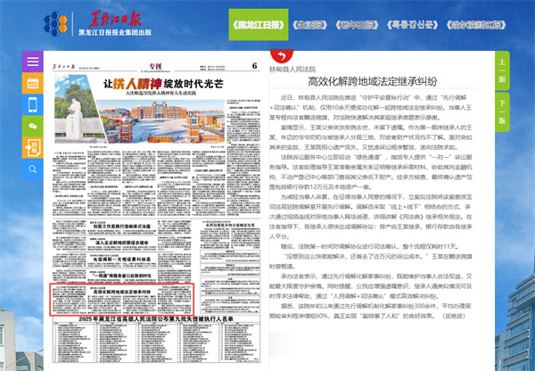 《黑龙江日报》:林甸县人民法院 高效化解跨地域法定继承纠纷