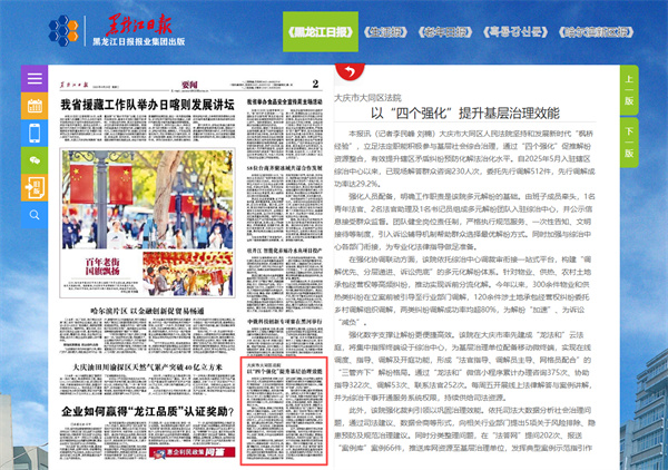 《黑龙江日报》:大庆市大同区法院 以“四个强化”提升基层治理效能