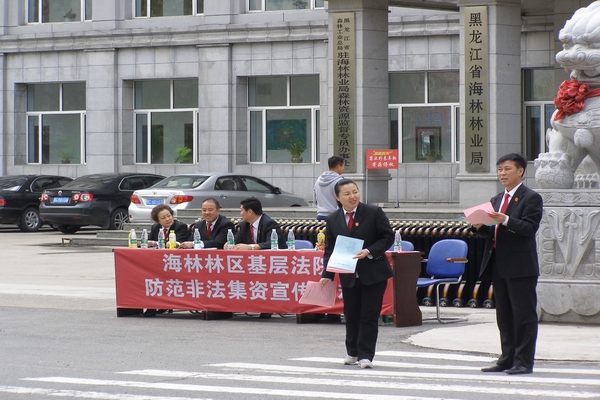 为进一步提高社会公众对非法集资犯罪的防范意识,增强林区人民群众对非法集资危害性的认识和识别能力,营造海林林区良好的防范非法集资舆论氛围,切实保护人民群众的合法权益,5月23日,海林林区基层法院联合海林林业社区街道办和林业局宣传处开展了防范非法集资宣传活动。在活动现场,干警通过悬挂防范非法集资标..