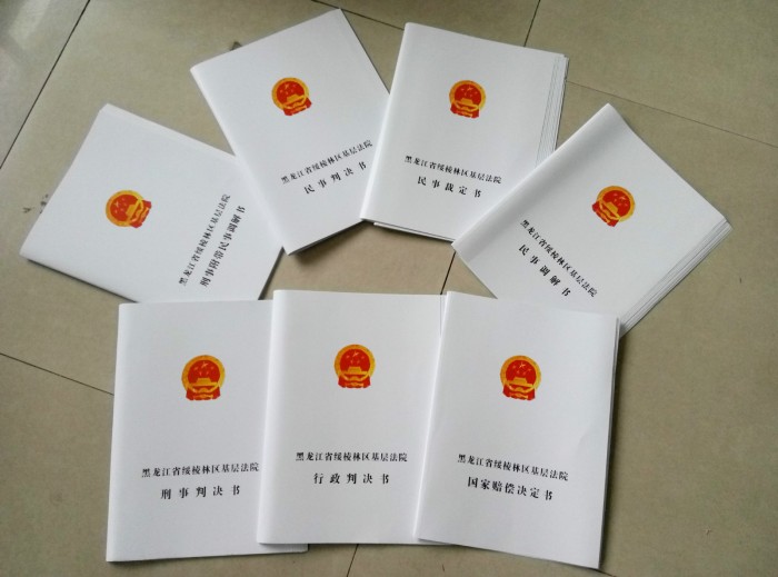 近日,绥棱林区基层法院对其送达的民事判决书、民事调解书、民事裁定书、刑事判决书、行政判决书、国家赔偿决定书、刑事附带民事调解书等七类法律文书启用制式封面。该制式封面为对开型,采用国际通行A3白色封面纸印制而成。封面由庄严的国徽图案、法院名称和裁判文书名称三部分组成,美观整洁、庄重严肃,体现了法律的权..
