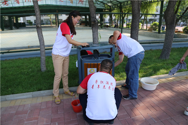7月26日早7时,齐铁法院青年志愿服务队到齐齐哈尔铁路南体育场义务劳动,对场内体育设施进行清洗。场内设施因体育场改造,沾染灰尘较多,影响了来到体育场进行体育锻炼的居民。但青年志愿者们不怕脏,不怕累,分工合作,干劲十足。志愿者们利用个人时间,为社会服务,得到现场居民的赞许,经过1个小时的辛勤劳动,..