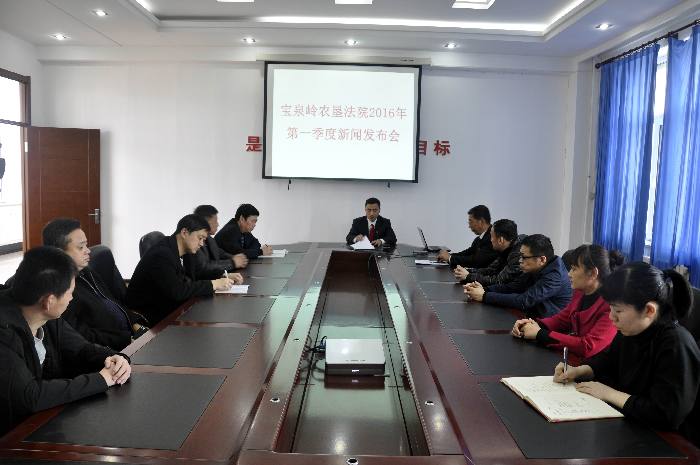 4月18日,宝泉岭农垦法院召开了2016年第一季度新闻发布会,政工处主任孙明波主持新闻发布会,新闻发言人、副院长陈嘉道通报了法院今年重点工作任务。宝泉岭管理局地区的部分(鹤岗市、萝北县)人大代表、政协委员、廉政监督员、人民陪审员,宝泉岭管理局宣传部、电视台、宝泉岭农场等单位代表、律师代表、群众代表受邀参..