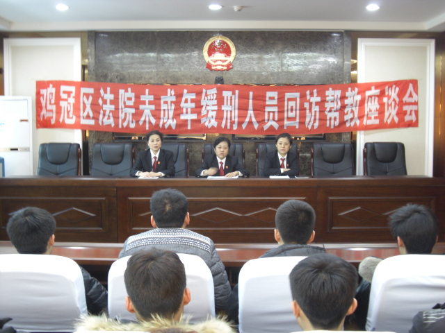 1月10日,鸡西市鸡冠区法院召开了由近期判处的30余名缓刑人员和家长共同参加的帮教回访座谈会。进一步加强未成年缓刑人员的监督和管理,全面掌握缓刑人员在缓刑考验期间的生活、工作和学习情况,促使他们在缓刑考验期内遵纪守法,平安、快乐地欢度春节,座谈会上,鸡冠区法院少年法庭的法官向到会的少年犯讲解了缓..