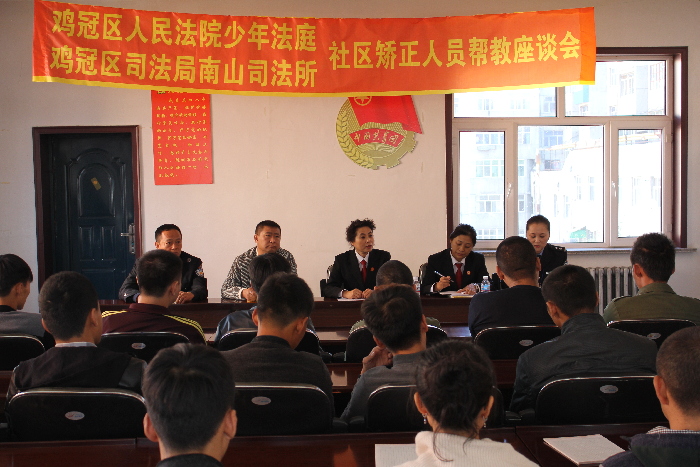 《社区矫正办法》实施后,鸡西市鸡冠区法院少年法庭主动与鸡冠区司法局南山司法所、南山办事处联系,配合社区矫正机构做好矫正人员的转化工作。并于国庆节前,共同组织召开了缓刑少年及其家长帮教座谈会。座谈会上南山司法所所长杜辉介绍了社区矫正人员奖惩的规定及违反缓刑规定人员予以收监执行的情况,并对缓刑少..