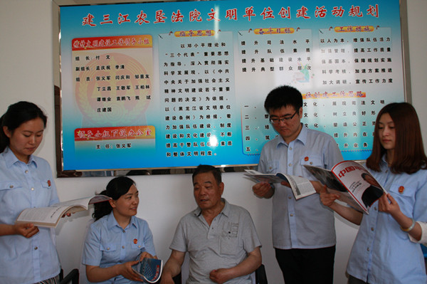 建三江农垦法院党总支根据管理局《关于开展庆祝建党九十二周年推进服务型党组织建设“七个一”系列活动的通知》要求,以创新实施党建工作“细胞工程”为突破口,要求各支部结合法院工作的特点,开展丰富多彩的“七个一”系列活动。法院第三党支部邀请本支部已退休的老党员、老法官参观法院党建活动室、阅览室。老法..