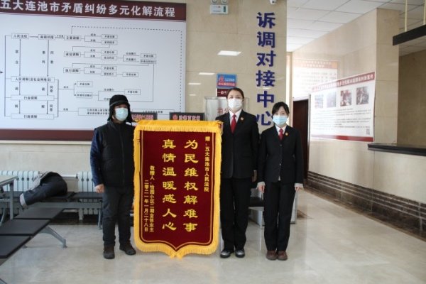 2月5日,五大连池市某小区业主代表来到五大连池法院,代表167户业主将一面印有“为民维权解难事,真情温暖感人心”的锦旗送到了诉调对接中心工作人员手中,感谢法院为百姓解纠纷,并为诉调对接中心工作人员加班加点,耐心细致的工作点赞。2020年8月,五大连池市某小区100多户住户与开发商因购楼款产生纠纷,要求开..