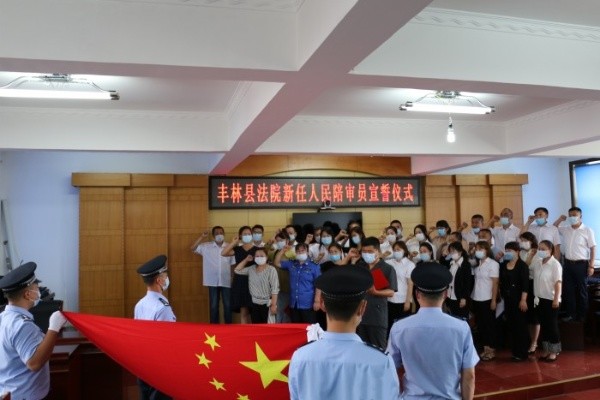 8月4日下午,丰林县法院举行新任人民陪审员宣誓仪式暨岗前培训班。在宣誓仪式上,39名人民陪审员在丰林县法院副院长荣华的领誓下,面向国旗庄严宣誓:“我是中华人民共和国人民陪审员,我宣誓:忠于国家,忠于人民,忠于宪法和法律,依法参加审判活动,忠实履行陪审职责,廉洁诚信,秉公判断,维护社会公平正义!”..