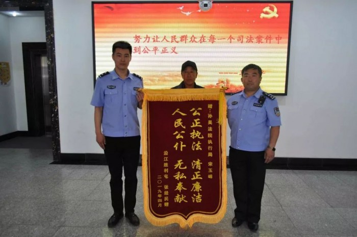 “真是太感谢宋局长了,帮我把这11万要回来了,我今天就是专程感谢你的。”近日,申请人老张将一面印有“公正执法 清正廉洁 人民公仆 无私奉献”的锦旗送到孙吴县法院执行局副局长宋玉峰的手中,感谢他为自己要回了辛苦钱。据悉,本案是一起民间借贷纠纷,2017年3月,孙吴县法院判决被告王某偿还原告老张本金加利息..