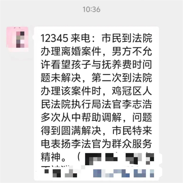 近日,鸡西市鸡冠区法院收到来自“12345”市民服务热线的工单,希望对执行局的一名干警进行表扬……这是怎么一回事呢?申请执行人徐某1与被执行人王某婚姻家庭纠纷一案,经鸡西市鸡冠区人民法院作出的民事调解书,判令被执行人王某于2023年9月起,每月给付徐某1抚养费800元至徐某2年满十八周岁时止、王某每月探视婚..