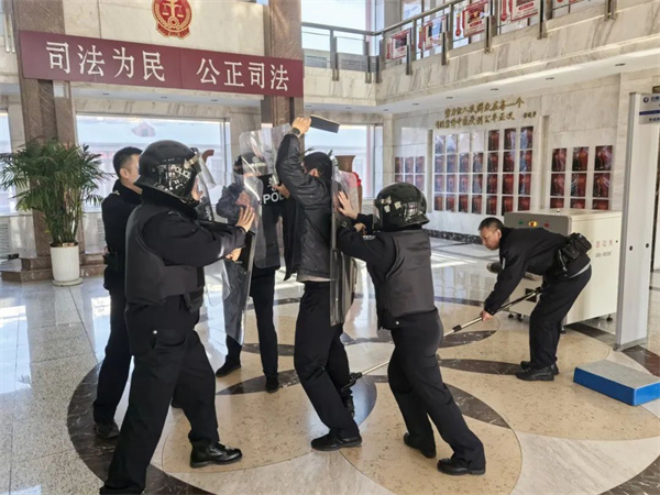 为贯彻落实省法院“一要二统三抓实”工作思路,切实提升人民法院司法警察预防和处置各类突发警情的实战能力,严控风险源头,确保审判执行工作安全有序进行。近日,伊春中院法警支队开展了防暴处突事件实战演练。演练现场,一名涉诉人员不顾劝阻,推搡执勤司法警察,并持刀强行冲入法院内部。面对突如其来的状况,执..