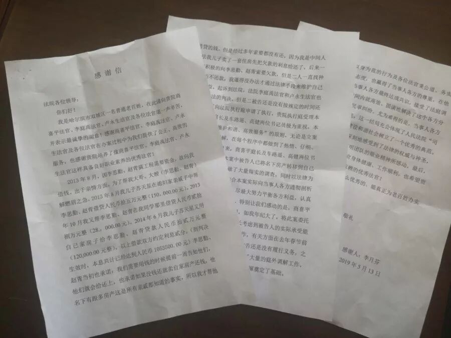 可是好几年过去了,这笔钱一直没有还,我儿子先变卖自己的一套住房把利息还上了,被逼无奈,我起诉到法院。李廷禹法官秉公办案,维护了我的合法权益,我拿着胜诉判决来到法院申请执行。