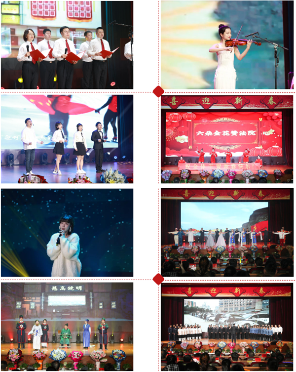 整场演出共24个节目,歌舞、快板、小品、诗朗诵、器乐演奏等形式丰富多彩。法院干警以欢歌热舞点赞共和国、讴歌新时代,充分展现了昂扬向上、开拓进取的精神风貌。在集体舞《龙腾盛世》的喜庆氛围中,文艺汇演拉开了帷幕。