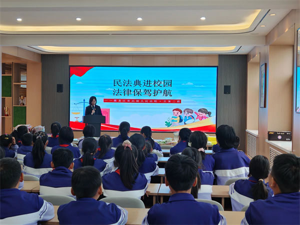 黑龙江高院刑一庭和立案二庭的法官们融合刑法、民法知识,通过图片展示、案例分析、互动问答等方式,用生动鲜活、通俗易懂的语言,向孩子们讲述了“什么是法”“防范校园欺凌”“民法典是什么”“民法典怎么守护我们”等内容,为孩子们上了一堂生动的法治课,教育引导孩子们树立法治意识,学会自我保护本领,勤奋学习、锐意进取、昂扬向上,争当胸怀大志、品学兼优的新时代好少年。