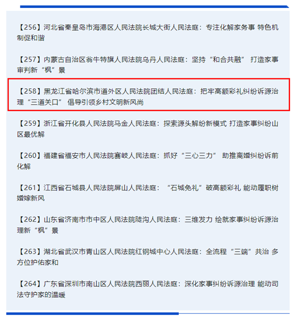 近日,最高人民法院发布“打造枫桥式人民法庭 促推婚姻家事纠纷诉源治理”典型案例,黑龙江法院一案例入选。