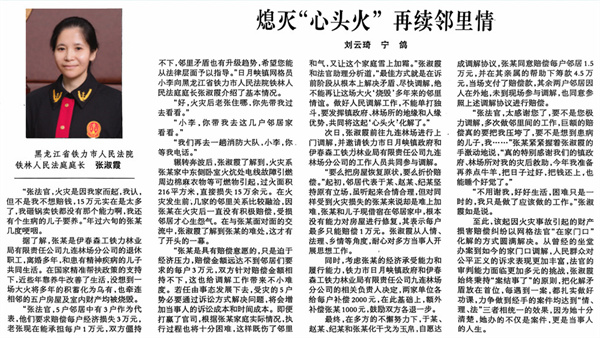 辗转奔波后,张淑霞了解到,火灾系张某家中东侧卧室火炕处电线故障引燃周边棉麻衣物等可燃物引起,过火面积216平方米,直接损失15万余元。在火灾发生前,几家的邻里关系比较融洽,因张某在火灾后一直没有积极赔偿,受损邻居才心生怨气。在与张某面对面的交流中,张淑霞了解到张某的难处,这才有了开头的一幕。