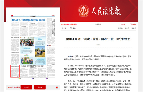 据悉,为让“刑事追责﹢生态修复”落地,呼玛法院创新构建“判决﹢监管﹢回访”三位一体机制,联合林业部门、乡镇政府成立监管小组,全程监督苗木补植与成活情况,定期开展“回头看”,形成治理闭环。今年以来,该院已审理环境资源案件12起,推动补植苗木4.2万株,修复林地520亩,苗木成活率超85%,受损林地逐步重焕生机。
