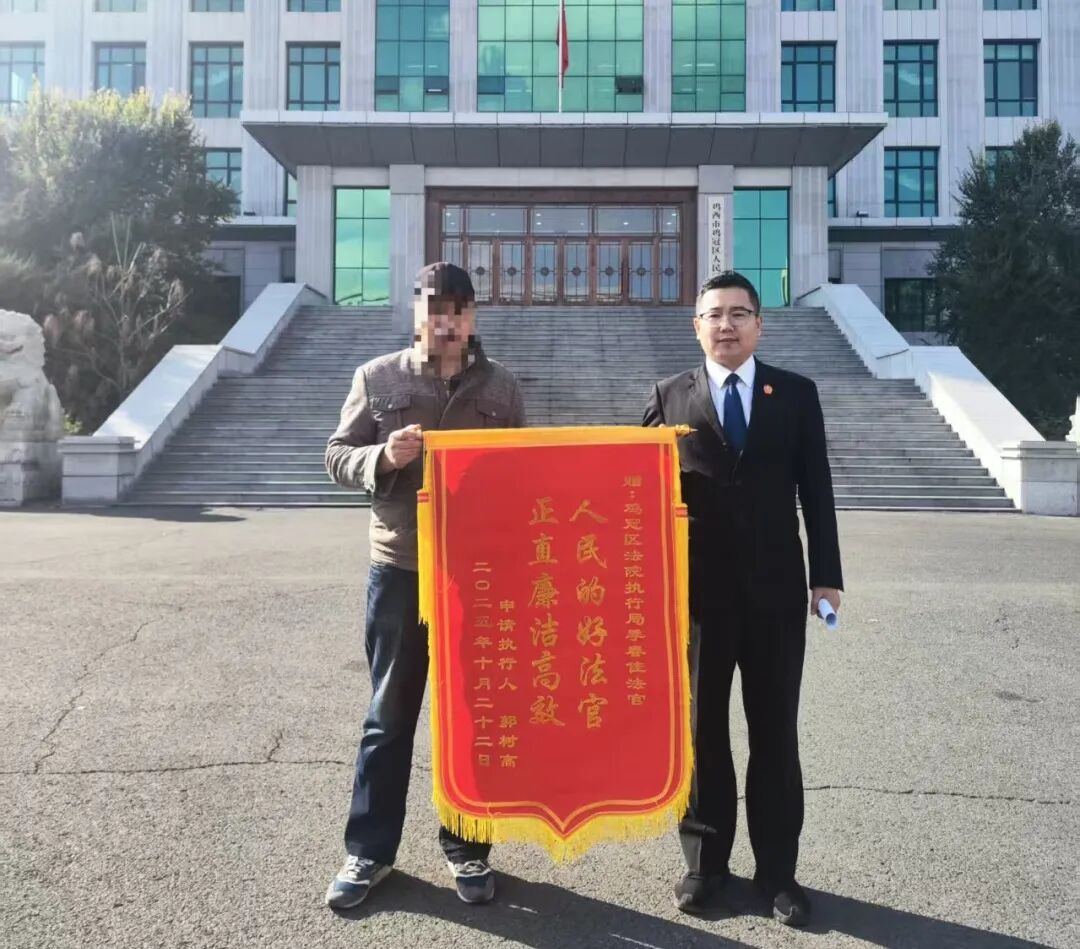 近日,申请执行人郭某某将一面写有“人民的好法官 正直廉洁高效”的锦旗送到鸡冠区人民法院执行局,紧紧握住执行干警的手激动地说:“我们都没抱有多大的希望,没想到法官真的帮我们执行回来一部分,真是太感谢了!”锦旗上的鎏金大字,不仅承载着当事人对执行工作的认可与赞誉,更彰显了法院执行局在“雷霆2025·煤城风暴”专项行动中攻坚克难、为民司法的坚定决心。